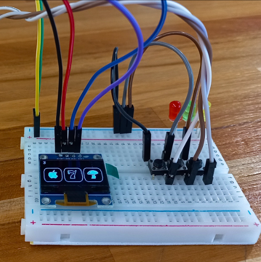The slot machine is a gaming device that simulates the operation of a slot machine. The project involves the use of electronic components and programming to create a functional gaming machine. The materials required for assembly include an Arduino Uno, enabling the development of electronic projects, an LCD display, consisting of a thin panel used to display electronic information such as text, images, and videos, and three push buttons. These buttons will be used to stop the game (left button), configure the difficulty level (middle button), and start the game (right button). It was also necessary to use a prototyping board, which has holes and internal connections for circuit assembly and is used to test electrical components. Other equipment includes jumper cables and wires, which are small conductors used to connect points in an electrical circuit, and a box or structure to house all the components.The physical assembly begins with connecting the LCD display to the Arduino Uno using jumper cables, following the display's pinout scheme. Next, we connect the three push buttons to the Arduino for the functions of "Stop," "Configure Level," and "Bet." Afterward, we assemble all the components in a box to create the cabinet of the slot machine.The game operates when the player places a bet using the "Bet" button. After the bet, the program checks for winning combinations on the reels. It is important to note that the player can stop the machine at any time by pressing the left button and configuring the level using the middle button.